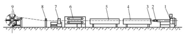 Hiện nay, ống PVC và PO là những sản phẩm có khối lượng lớn nhất cả trong nước và quốc tế.Hình 1trình bày sơ đồ quy trình sản xuất ống polyolefin (PO). Nhựa được đưa vào khuôn có khe hở hình khuyên (2) bằng trục vít dưới dạng nhựa nóng chảy đồng đều, tạo thành một ống parison. Điều này ngay lập tức đi vào thiết bị hiệu chuẩn (3) để làm mát và định cỡ, sau đó trải qua quá trình làm mát đầy đủ hơn nữa trong bể làm mát (4). Ống được kéo ra với tốc độ không đổi bằng thiết bị điều chỉnhđơn vị vận chuyển(6)và cuối cùng được cắt theo chiều dài xác định bằng máy cắt (7). Các ống có thành mỏng có đường kính dưới 160mm có thể được cuộn thành cuộn bằng máy cuốn (9).
