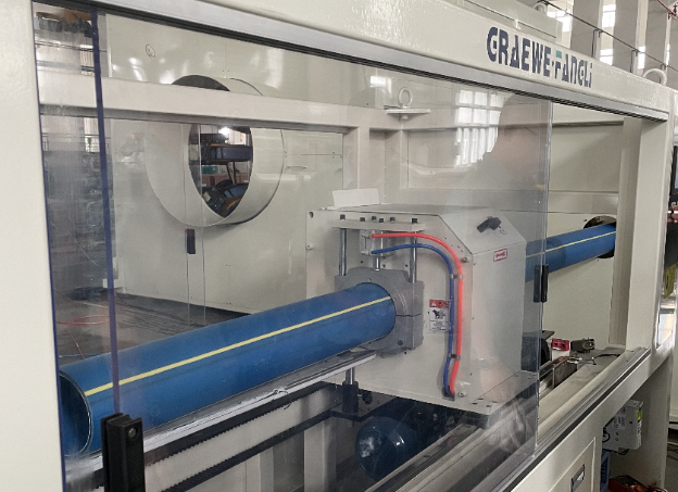 Thứ tư, đường ống được kéo bởi bộ phận kéo sâu bướm và được đưa vào máy cắt, nơi đường ống được cắt theo chiều dài định sẵn; đồng thời, bụi cắt được loại bỏ bằng máy hút bụi.