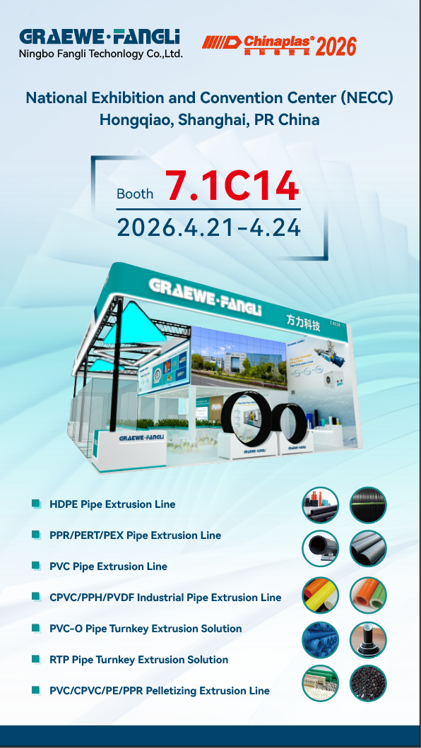 मराठी Chào mừng đến với gian hàng 7.1C14 của chúng tôi tại ChinaPlas 2026,Công ty TNHH Công nghệ Fangli Ninh Ba(sau đây gọi là "Fangli") chuyên về R&D, sản xuất và kinh doanhthiết bị ép đùn nhựa, dây chuyền sản xuất bảo vệ môi trường mới, máy hàn ống nhựa và máy phụ trợ nhựa.